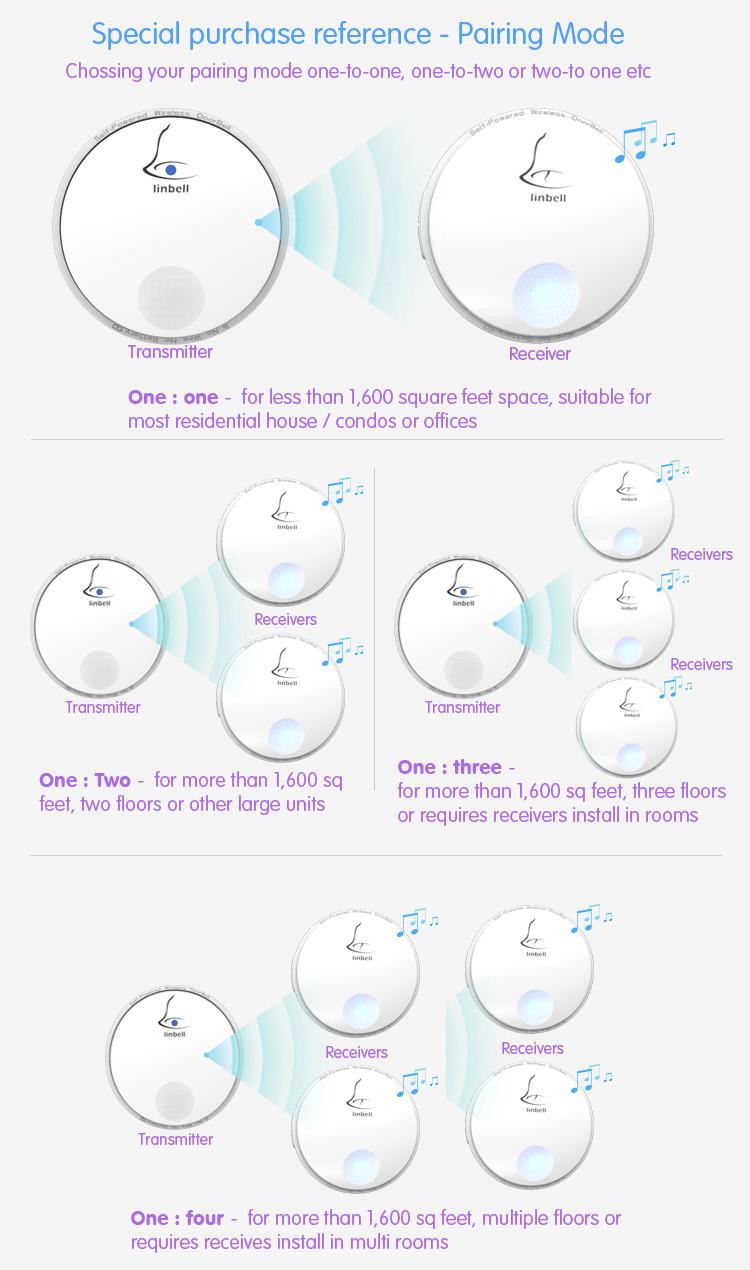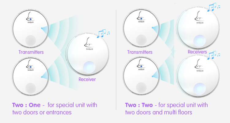 The Linbell G2 series of doorbell has a very unique feature, it can be configured with different numbers of transmitters and receivers, depending on the requirements of deployments.