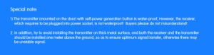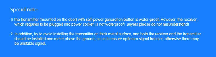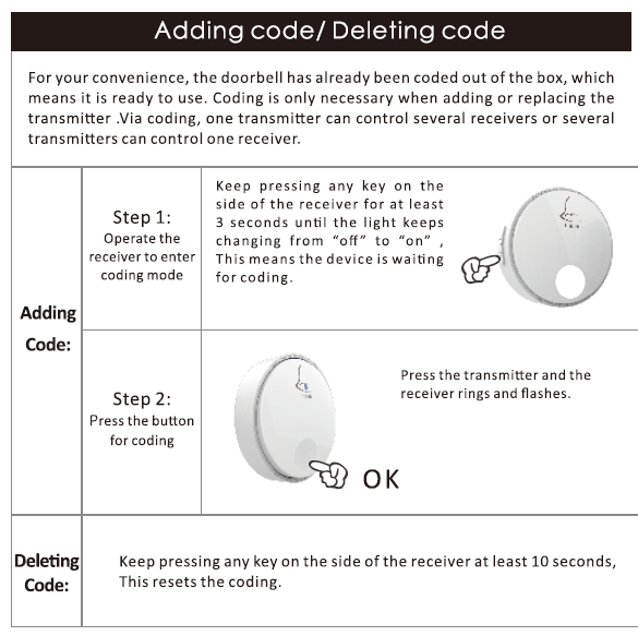 For buyer’s convenience, all doorbell set had already been coded out of the box when shipped, which means it is ready to be used. Coding is necessary when adding or replacing the transmitter. Through coding, one transmitter can control from one to several receivers, or several transmitters can control one receiver.