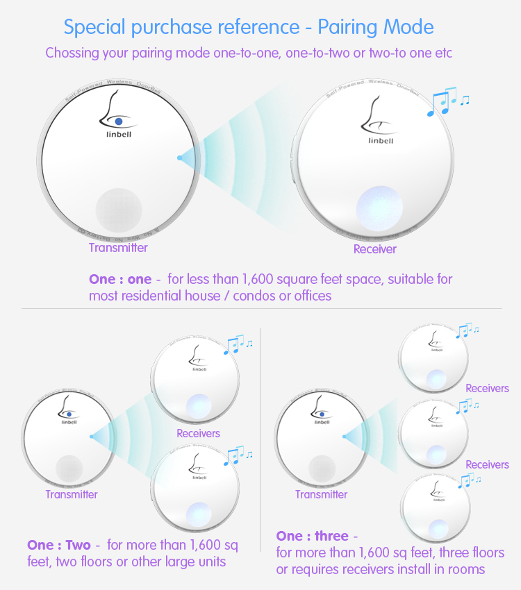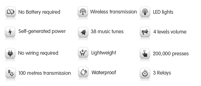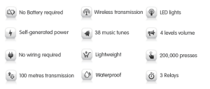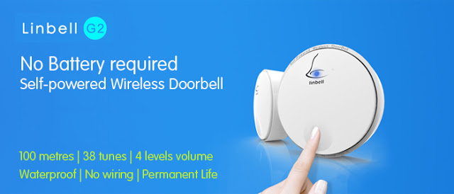 Linbell G2 self-power new generation wireless doorbell requires no battery, using the pressing of button to convert kinetic energy into electrical energy, to achieve the self-generating power. For installation, it requires no wiring as in the traditional doorbell, as it operates on a wireless transmission, with up to 100 metres distance, and if configured with 3 relays, it can reach a maximum of 300 metres*.