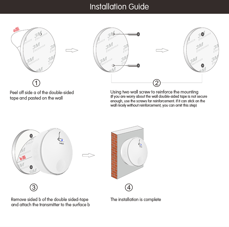 The accompanied 3M double-tape adhesive can be directly attached to the transmitter, using the 3M adhesive can ensure a solid paste on the wall, you can tear off without leaving adhesive residue.