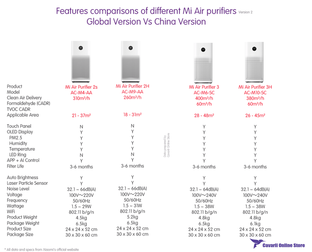 You can look at the 2 main specs, which is CADR and Applicable area, (in Red color above) both the equivalent “Global Versions” seem to have a lesser spec when compare with the “China versions”.