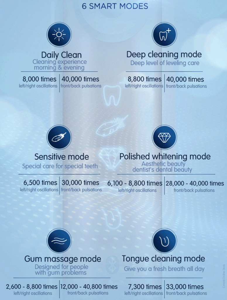 Tongue Cleaning – ideal for cleaning the tongue and inside of the cheeks and the tongue cleaning mode lasts for 20 seconds oscillates 7,300 times and pulsates 33,000 times per minute.