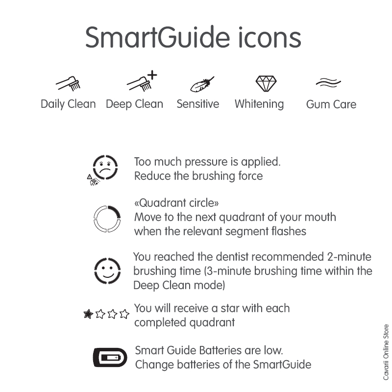 - A short, stuttering noise reminds you at 30 second intervals to clean all four areas of your jaw (upper right, upper left, lower right and lower left) for the same amount of time (30 seconds).