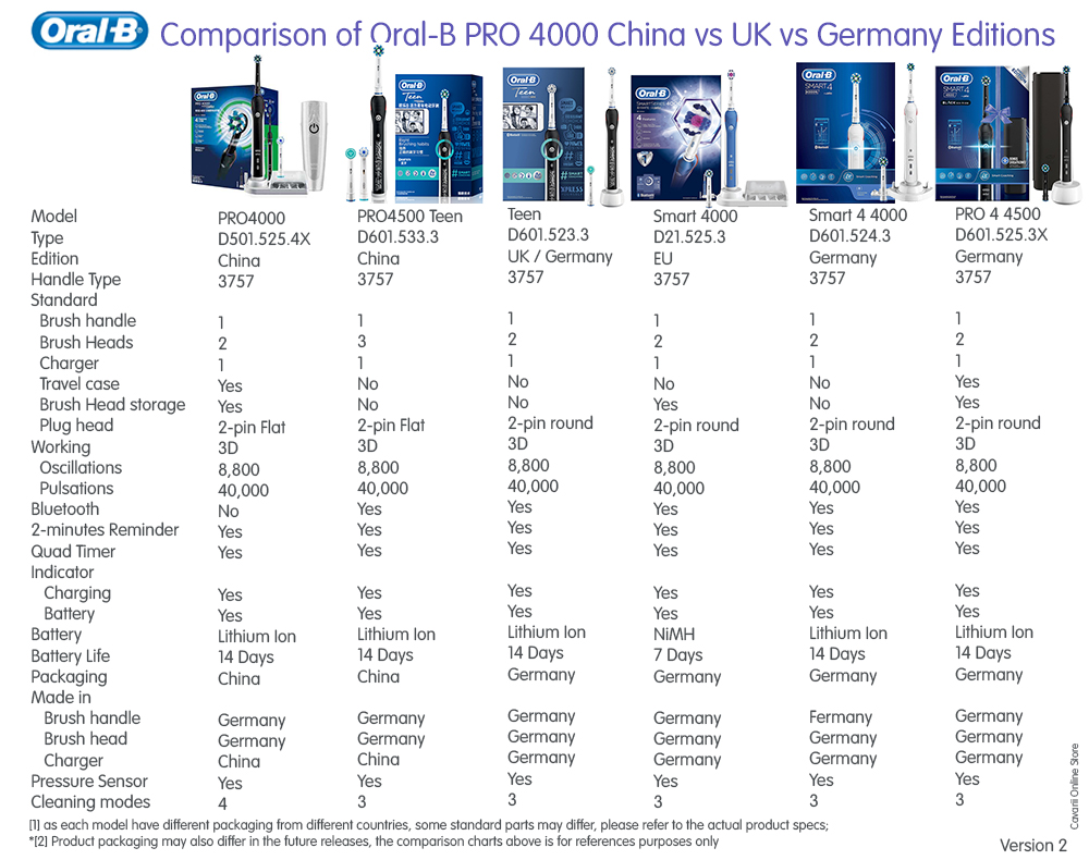 Similarly, for China packaging, i.e “China Edition”, packaging is printed in both Chinese/English, for local market’s requirements, they will package with 220 ~240V 2-pin flat plug, for “China Edition”, and packaging for China market are generally more generous, usually with extra replacement brush heads, and usually coming with an original travel case for most models.