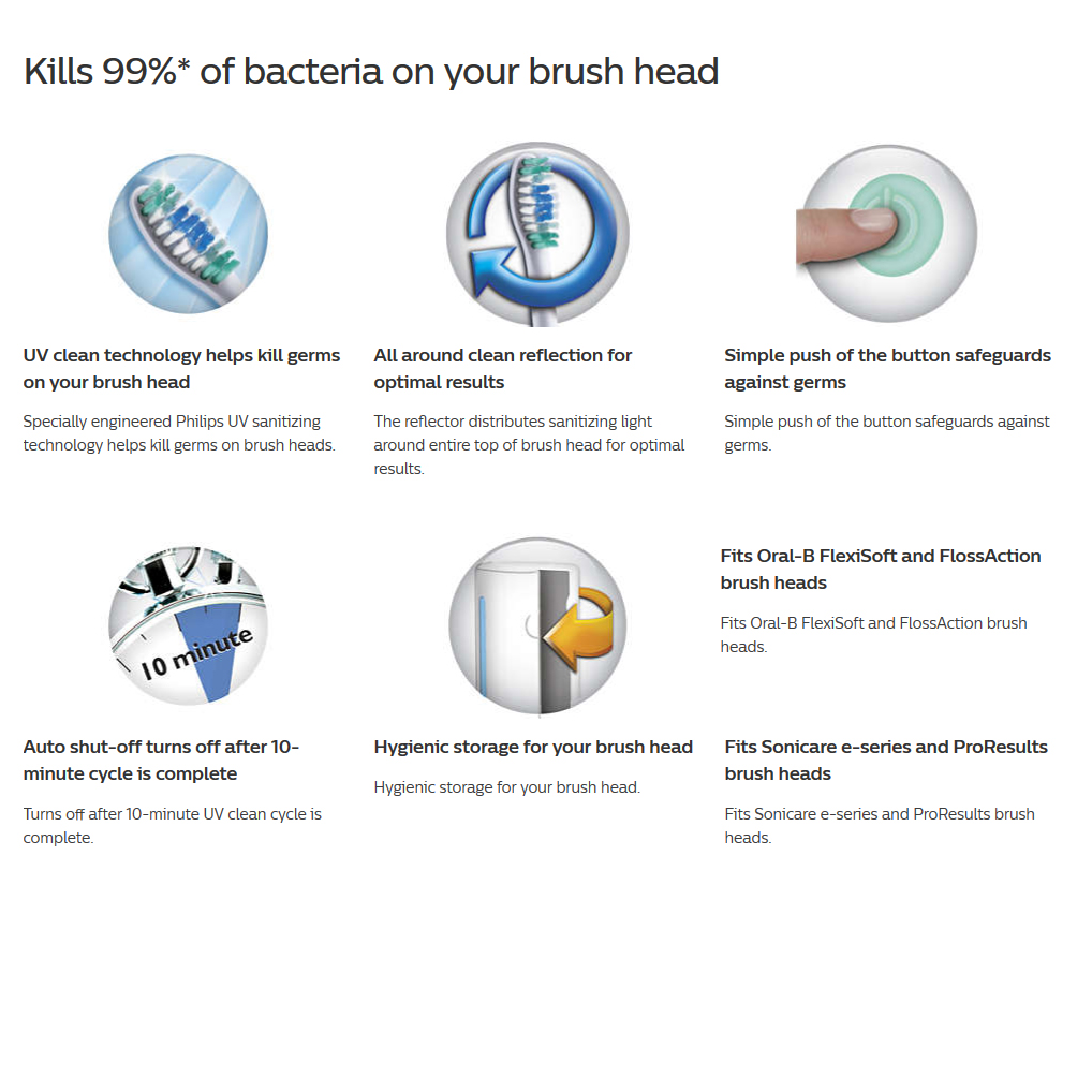 Philips Sonicare introduces a new innovation with a UV Sanitizer that helps kill up to 99% of bacteria* on your toothbrush. With a simple push of a button, UV Clean technology sanitizes your brush head to clean right down to the bristles.