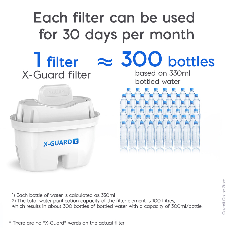 The recommended rated filter purification capacity is 100 litres, and based on 3 litres consumption daily, it will last a month. As there are accumulated contaminants in the filter over a period of time, Phlips recommend to change the filter cartridge every 30 days.
