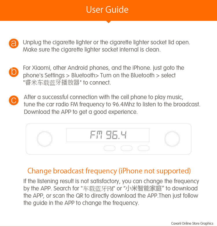 4. We recommend an FM frequency in accordance with the recommendations of the App to maintain the highest sound quality;