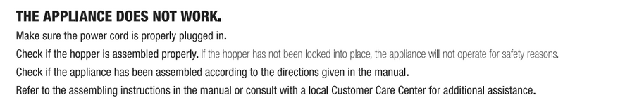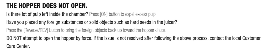 If the Juicer does not start (the following steps were found in the Hurom manual) Check if the appliance has been assembled according to the directions given in the manual. Check if the hooper is assembled properly, if the hooper has not been locked into place, the juicer will not operate for safety reasons Make sure the Chamber arrow is aligned with the hooper arrow, when you hear a “click” sound.