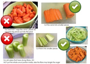 We recommend preparing your vegetables by cutting them into a size so that the pieces will just fall through the feeder chute without needing to be pushed down. Chop carrots into half-inch discs and all other root vegetables such as beetroot to a similar size.