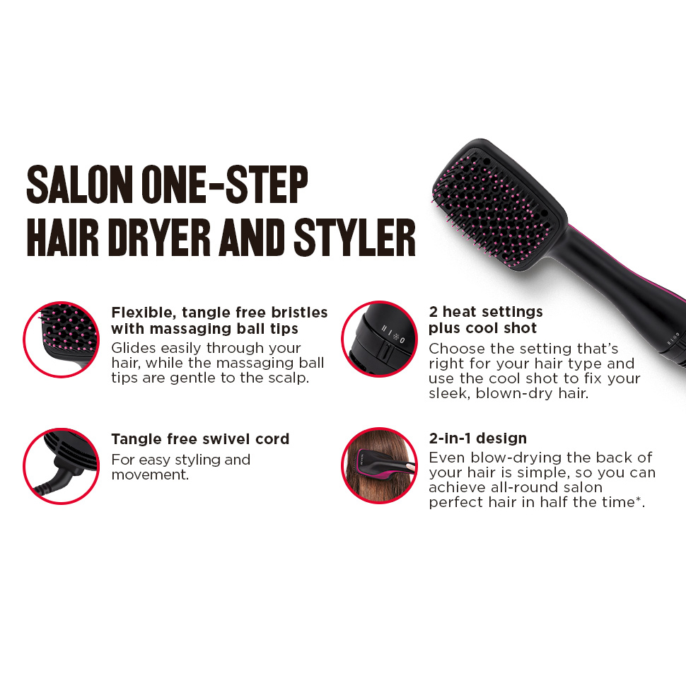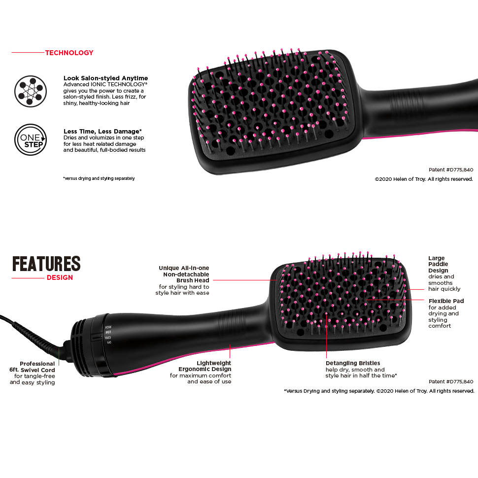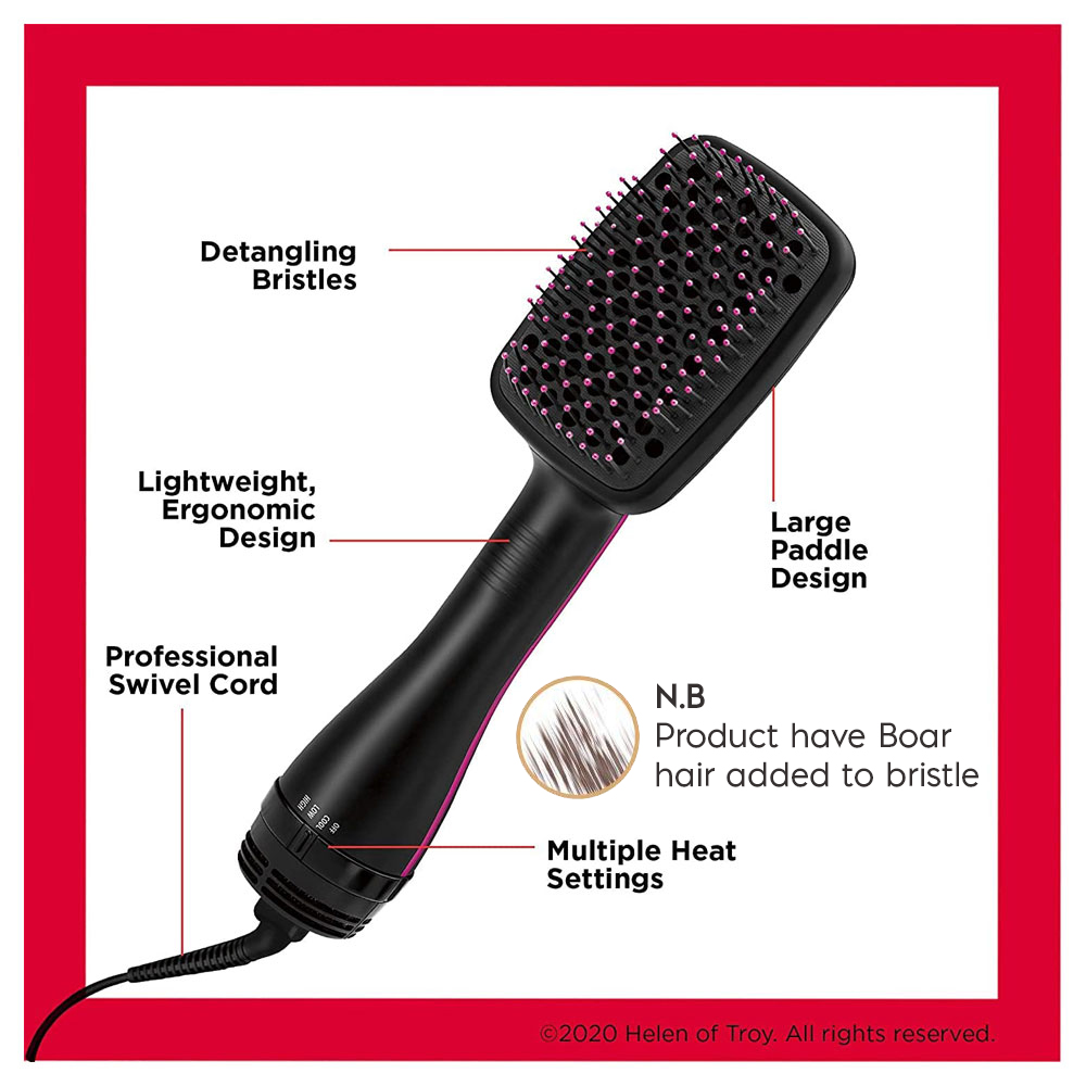 This helps condition, smooth and makes hair shinier, while reducing frizz and static. Large Paddle Design Dries and smooths hair quickly Detangling Bristles Help dry, smooth, and style hair in half the time 2 Heat Settings + Cool shot For complete drying and styling flexibility Styles back of hair with ease Lightweight Design For comfort and ease of use Professional Swivel Cord For tangle-free and easy styling