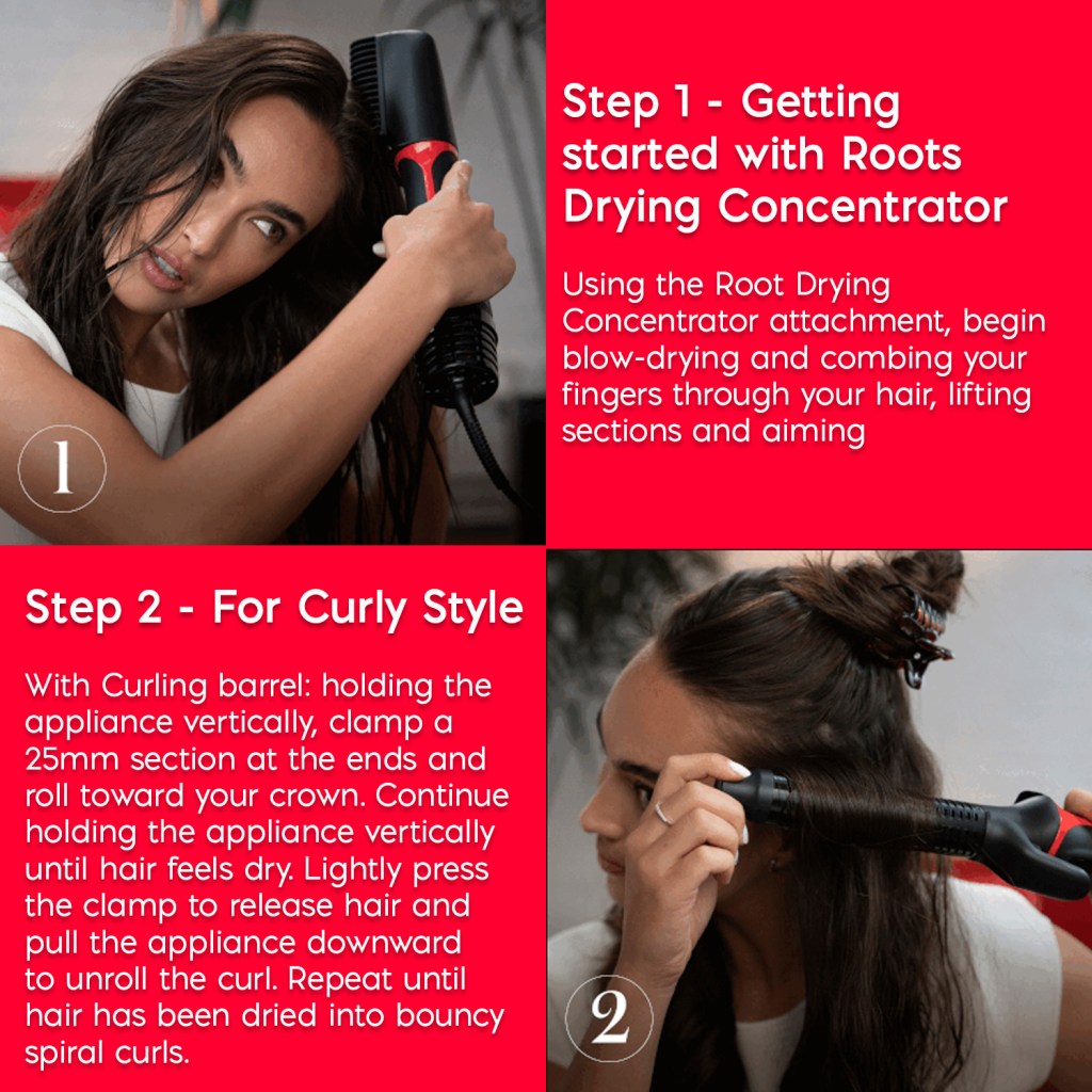 Dry, curl and volumise with the 3 interchangeable attachments to create salon-worthy styles in up to half the time* with less damage.