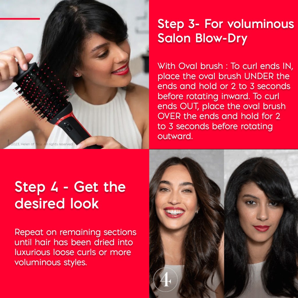 Unique oval brush design smooth hair while the rounded edges quickly create volume at the root and beautifully full-bodied curls at the ends in a single pass, for salon blowouts at home